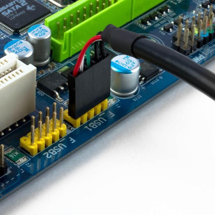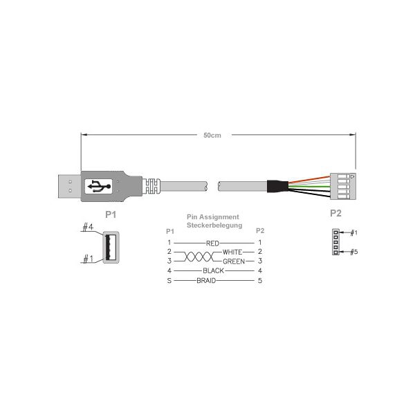 Die Belegungsreihenfolge des Boardsteckers ist: rot (VCC, +5V), weiß (D-), grün (D+), schwarz (GND, Masse), schwarz (Abschirmung). Dies entspricht dem Marktstandards.