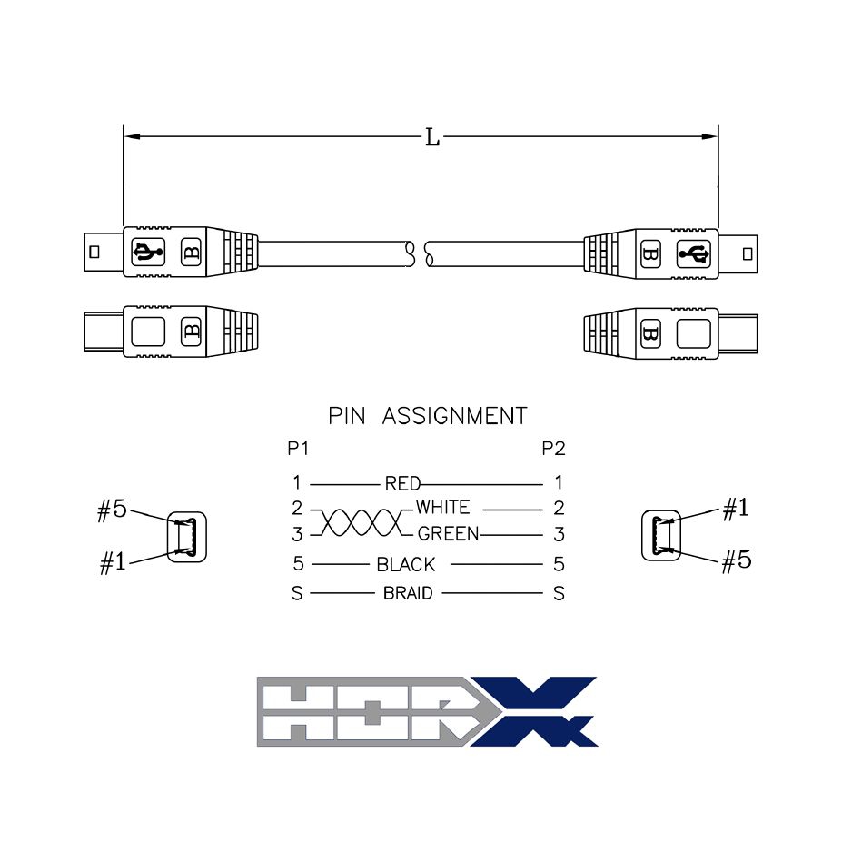 Die Pin-Belegung diese Kabels entspricht der USB-Norm, die für den USB Mini B Stecker eine 4-polige Belegung vorsieht. Die Pins 1, 2, 3 und 5 der beiden Mini-B-Stecker sind 1-zu-1 verbunden (siehe Belegungsplan). Pin 4 ist nicht belegt und nicht verbunden.