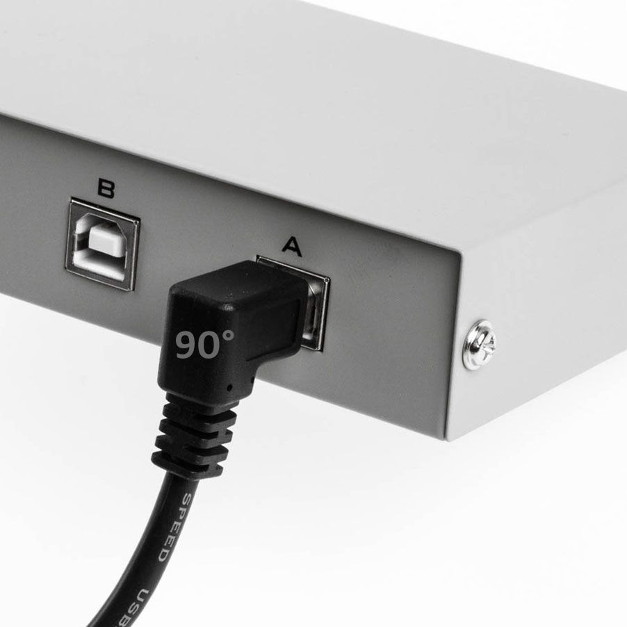 Das hier angebotene USB 2.0 Kabel hat einen um 90° abgewinkelten USB-Stecker Typ B. Dadurch eignet sich das Kabel besonders für den platzsparenden Anschluss von USB-Geräten.