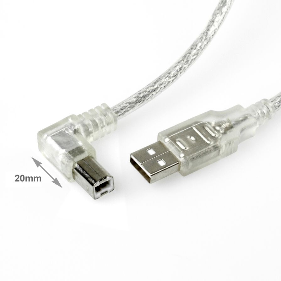 USB-Kabel mit abgewinkeltem B-Stecker (nach links), 2m, Premium-Qualität: USB 2.0 High Speed, 28AWG/1P 24AWG/2C, doppelt geschirmt, Farbe: Silber-transparent