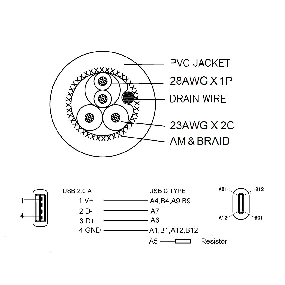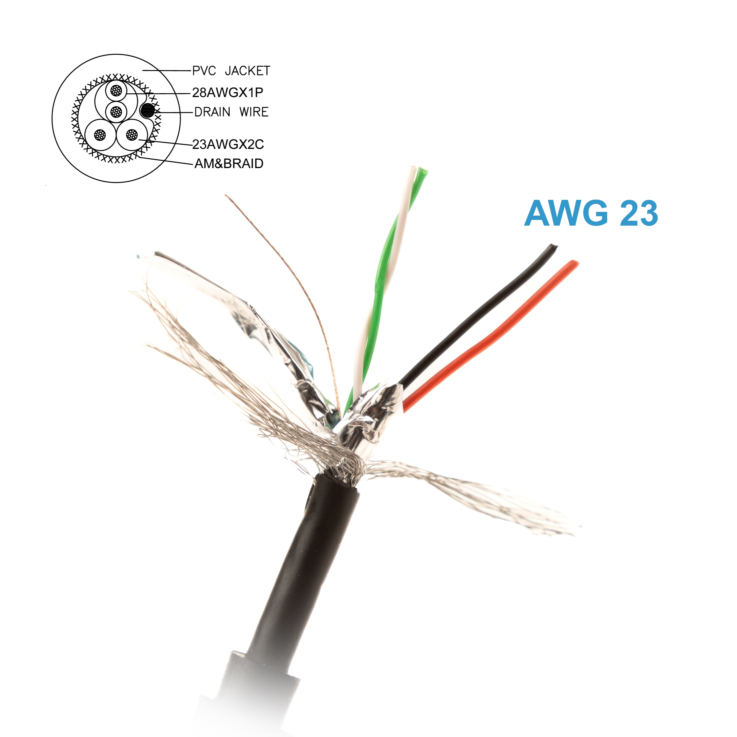 - Adernstärken: Data AWG 28/1P und Power AWG 23/2C (Kupferadern)