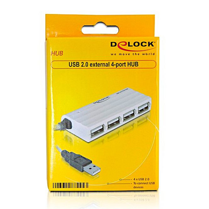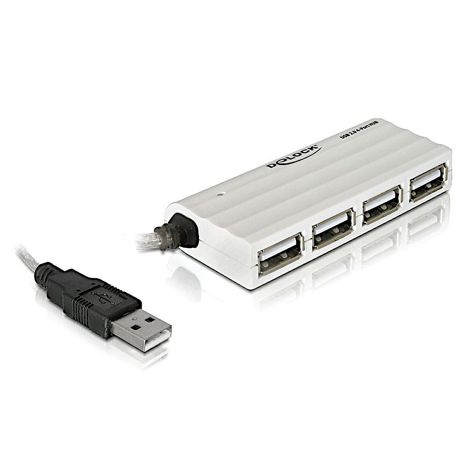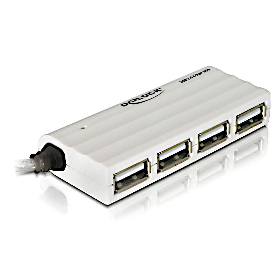USB 2.0 HUB, kleine Bauform, 4 Ports, Super Speed bis 480 MBit/s, arbeitet "bus powered" (ohne Netzteil), Hersteller: DELOCK