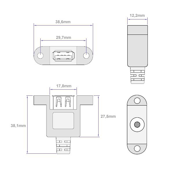- USB-A-Buchse mit seitlichen Laschen für Befestigung