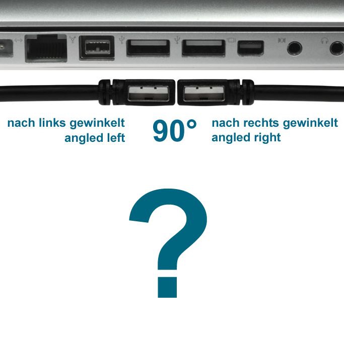 Auf der anderen Seite des Kabels befindet sich ein abgewinkelter USB-Stecker vom Typ A. Dieser Winkelstecker hat eine besonders platzsparende, kleine Bauform, so dass der Steckerüberstand nur ca. 15mm beträgt. Was wir unter der Winkelungsrichtung LINKS verstehen, wird durch die obige Abbildung deutlich. Bitte achten Sie auf die Position des Kontaktträgers des Steckers bzw. der Buchse.