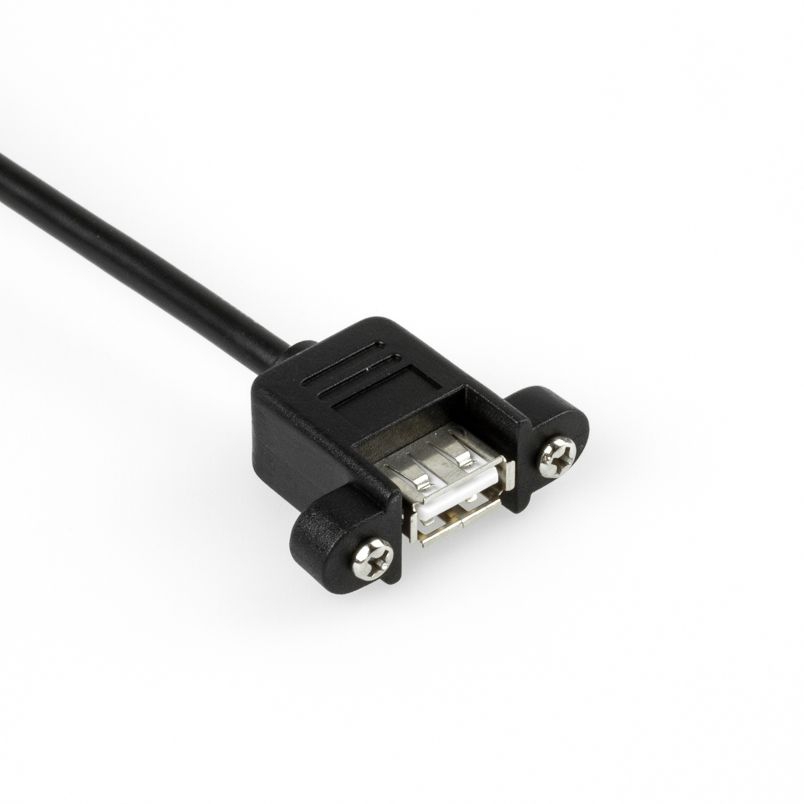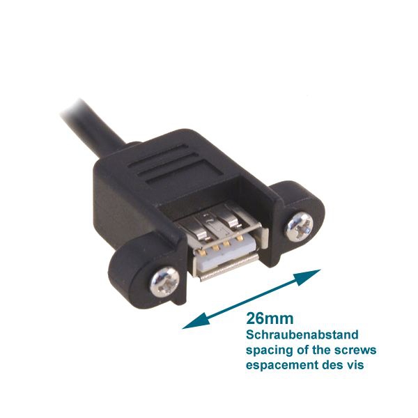 Die Buchse des Montagekabels (Typ A weiblich) ist anschraubbar. Der Schraubenabstand beträgt 26mm. Der Schraubentyp ist UNC 4/40. Durch den Einsatz von Montagekabeln wird quasi eine USB-Steckdose realisiert.