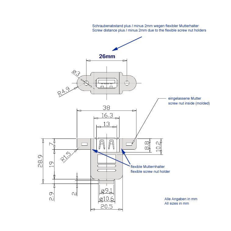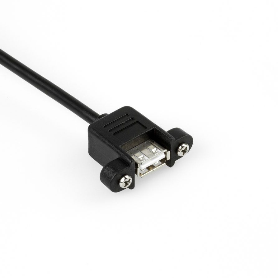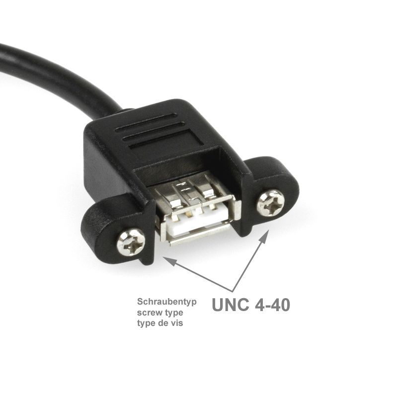 Die Buchse des Montagekabels (Typ A weiblich) ist anschraubbar. Der Schraubenabstand beträgt 26mm. Der Schraubentyp ist UNC 4/40. Durch den Einsatz von Montagekabeln wird quasi eine USB-Steckdose realisiert.