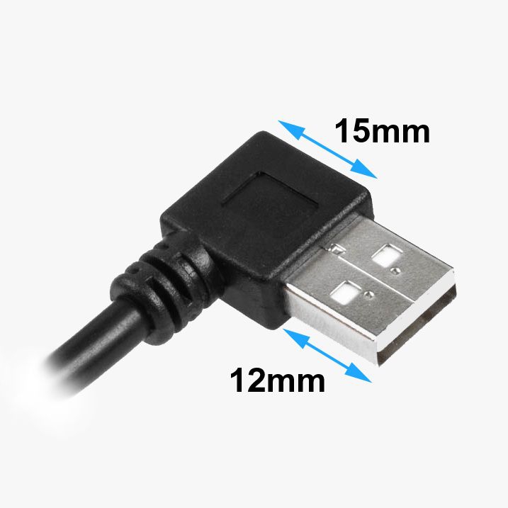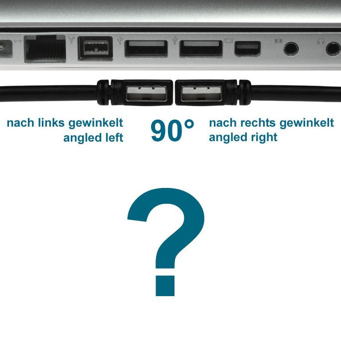 Auf der anderen Seite des Kabels befindet sich ein abgewinkelter USB-Stecker vom Typ A. Dieser Winkelstecker hat eine besonders platzsparende, kleine Bauform, so dass der Steckerüberstand nur ca. 15mm beträgt. Was wir unter der Winkelungsrichtung LINKS verstehen, wird durch die obige Abbildung deutlich. Bitte achten Sie auf die Position des Kontaktträgers des Steckers bzw. der Buchse.