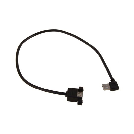 USB-Montagekabel 50cm: USB-A-Buchse (anschraubbar) an USB-A-Stecker (LINKS abgewinkelt), für USB 2.0 und USB 1.1 (bis 480 MBit/s), doppelt abgeschirmt, inkl. Schrauben