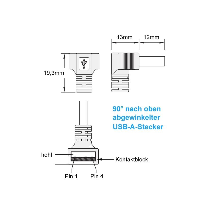 - Anschluss 2: USB 2.0 A Stecker (männlich) nach OBEN abgewinkelt
