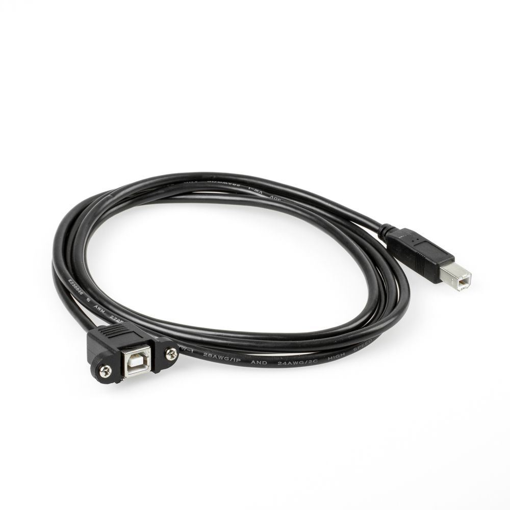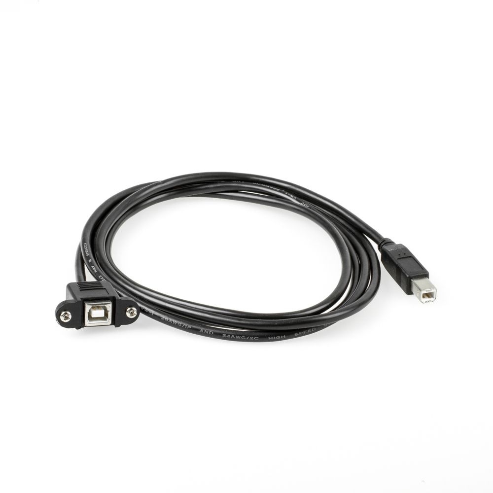 Die Buchse des Montagekabels (Typ USB 2.0 B weiblich) ist anschraubbar. Die beiden Schrauben und eingelassenen Muttern sind im Lieferumfang enthalten. Die Schrauben sind vormontiert. Auf der anderen Seite des Kabels befindet sich ein Stecker vom Typ B. In der hier beschriebenen Kabelversion ist der B-Stecker gerade. Bei partsdata ist aber auch eine platzsparende, 90° abgewinkelte Version lieferbar (Serie: CU-MB-xxD).