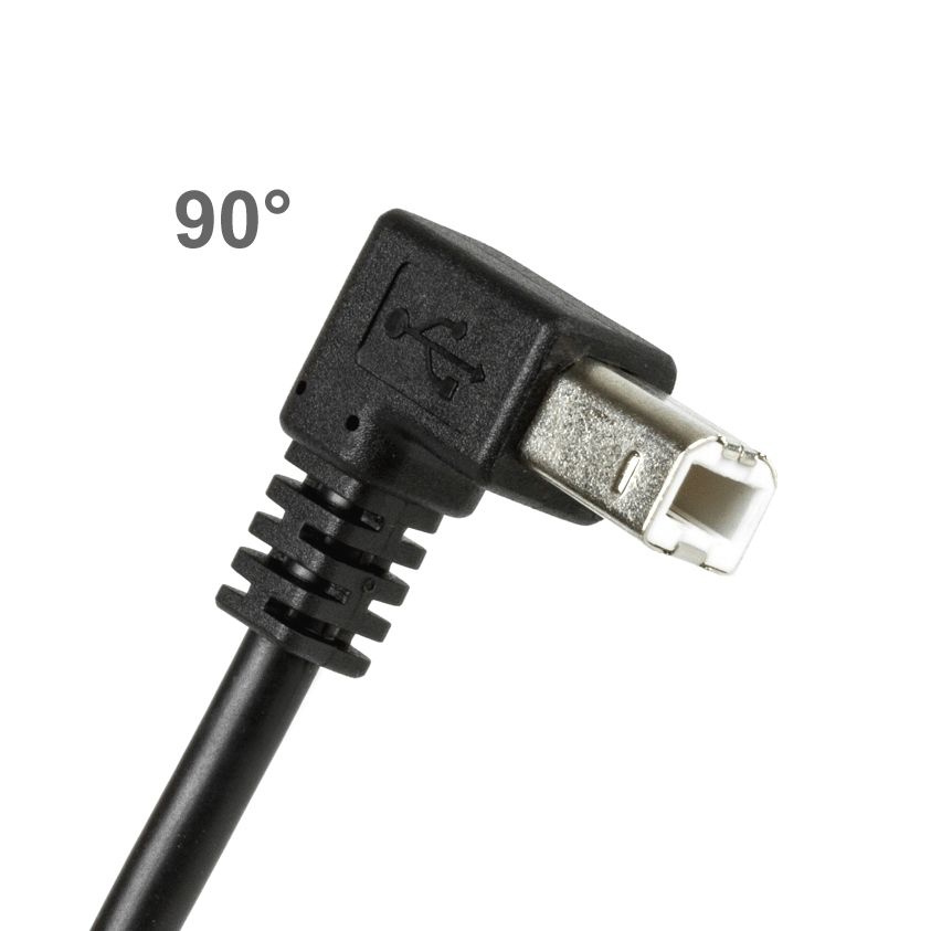 Die Buchse des Montagekabels (Typ B weiblich) ist anschraubbar. Auf der anderen Seite des Kabels befindet sich ein abgewinkelter Stecker vom Typ B. Wir bezeichnen diese 90° Winkelungsart mit "NACH UNTEN" abgewinkelt. Bitte prüfen Sie, ob die genannte Winkelrichtung auch für bei der gegebenen Position Ihrer USB-B-Buchse zutrfft.
