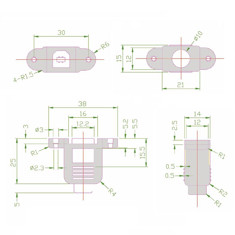 Die Buchse des Montagekabels (Typ B weiblich) ist anschraubbar. Der Schraubenabstand beträgt 30mm. Die 2 Schrauben (Typ UNC4/40) gehören zum Lieferumfang und sind vormontiert.