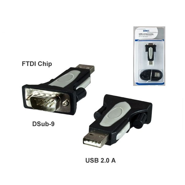 Der USB-2.0-Seriell-Adapter liefert einen DSub-9-Stecker (9 Kontaktstifte, männlich) als klassische serielle Schnittstelle (RS-232). Intern wird ein FTDI-Chipsatz verwendet.