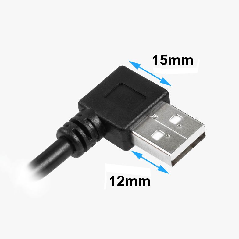 Das hier angebotene USB-Verlängerung hat einen um 90° abgewinkelten USB-Stecker Typ A. Dadurch eignet sich das Kabel besonders für den platzsparenden Anschluss. Der Stecker-Überstand beträgt nur ca. 15mm (siehe Abb.).