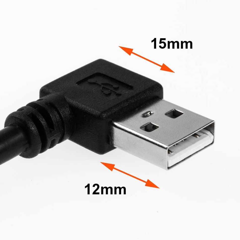 Die hier angebotene USB-2.0-Verlängerung hat einen um 90° gewinkelten USB-Stecker Typ A. Dadurch eignet sich das Kabel besonders für den platzsparenden Anschluss. Der Steckerüberstand beträgt nur ca. 15mm (Kunststoff-Gehäuse des Winkelsteckers in Einsteck-Richtung gemessen).