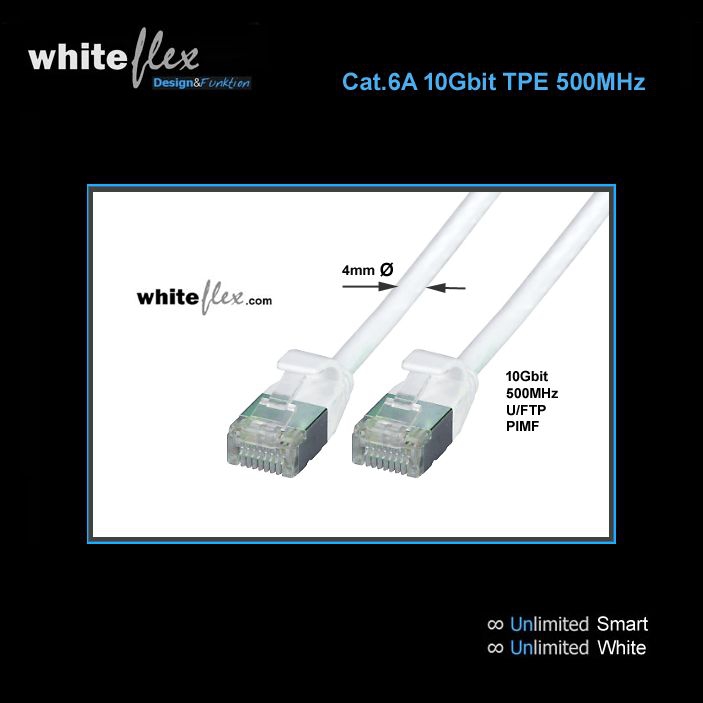 WHITEFLEX Cat.6A Patchkabel, 3m, weiss + flexibel, 10Gbit, 500MHz, Ø 4mm, U/FTP PiMF, TPE Mantel